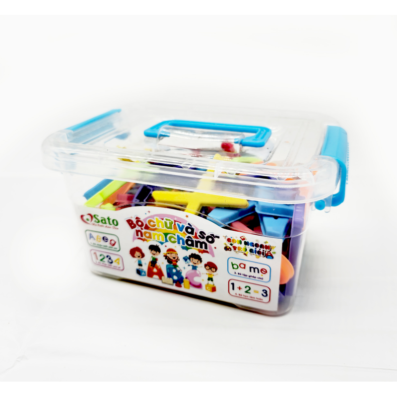 Đặc điểm nổi bật: – Bộ chữ và số nam châm tổng hợp được làm từ 100% nhựa nguyên sinh cao cấp và nam châm an toàn tuyệt đối với trẻ kể cả khi bé ngậm đồ chơi. – Với 6 màu sắc tươi sáng và chuẩn mực: đỏ, cam, vàng, xanh lá, xanh da trời, tím. Kích thích giác quan của bé và giúp bé nhận biết các màu sắc cơ bản. – Một bộ đầy đủ số và các chữ cái tiếng việt (chữ thường) để bé có thể học những phép toán đơn giản và ghép vần. – Sản phẩm có thêm que tính để giúp bé học toán dễ dàng hơn. Cách chơi: – Bé có thể tự chơi hoặc nhờ sự trợ giúp của ba mẹ để giờ chơi – học vui vẻ hơn và gắn kết tình yêu thương trong gia đình. – Với “Bộ chữ và số nam châm tổng hợp” bé có thể kết hợp với bộ bảng nam châm “Con ngoan trò giỏi” của SATO để các miếng chữ số nam châm có thể hút lên mặt bảng. Ngoài ra nếu không có sẵn mặt bảng từ, các bé có thể sử dụng ngay mặt tủ lạnh nhà mình để cho các hút các chứ số lên. Vừa học chúng mình lại vừa trang trí cho tủ lạnh thêm lung linh. – Bé học nhận biết màu sắc cơ bản như: đỏ, cam, vàng, xanh lá, xanh da trời, tím. – Bé học nhận biết các số từ 0 đến 9, các dấu: cộng, trừ, nhân, chia, bằng. – Bé ghép các số và dấu để tạo ra các phép tính như: 3+2=5, 2×3=6, hoặc bố mẹ dùng số và dấu để tạo ra các bài tập nhỏ nhỏ cho bé như: 4×2=?, 6-4=? …vv. – Bé học đếm với các que tính dễ thương, ba mẹ có thể ra câu đố cho bé như: Ba cho mẹ 2 quả táo, sau đó ba cho thêm mẹ 3 quả nữa vậy mẹ có mấy quả táo. Rồi dùng que tính để giúp bé học đếm thật dễ dàng và hiệu quả. – Bé học nhận biết chữ hoa tiếng việt: A, Ă, Â, B, C …vv, các dấu: sắc, huyền, hỏi, ngã, nặng và học ghép các vần tiếng anh đơn giản như: “ENGLISH”..