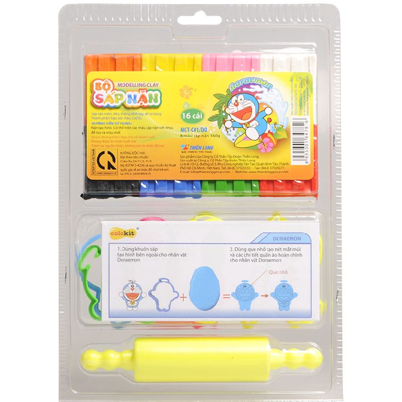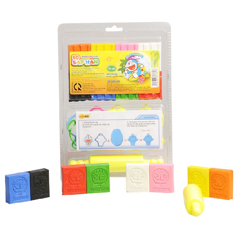 - Bộ sản phẩm bao gồm 8 màu sáp nặn, dao cắt sáp, rulo cán nặn và bộ khuôn tạo hình 6 nhân vật trong truyện Doraemon giúp các bé thỏa sức sáng tạo.
