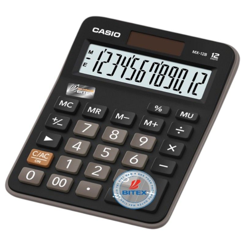 Máy tính Casio MX-12B là dòng máy tính để bàn kích thước trung bình với thiết kế hiện đại, vỏ ngoài bền bỉ và chắc chắn. Máy sở hữu màn hình lớn hiển thị 12 chữ số sắc nét, giúp việc quan sát dữ liệu rõ ràng và hạn chế sai sót khi nhập liệu. Sản phẩm tích hợp đầy đủ các tính năng tính toán cơ bản, tính phần trăm (%) và các phím chức năng tiện dụng, đáp ứng tốt nhu cầu của người dùng văn phòng, kế toán và kinh doanh. Nhờ hệ thống năng lượng hai chiều (pin và năng lượng mặt trời), máy luôn hoạt động ổn định và bền bỉ trong mọi điều kiện ánh sáng..