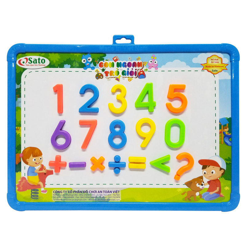 Bảng nam châm Con ngoan trò giỏi - Con giỏi toán Sato là đồ chơi kết hợp giữa vui chơi và học tập, giúp bé làm quen với việc học chữ số một cách vui nhộn. • Bộ sản phẩm gồm 26 chi tiết: 1 bảng từ có kích thước 36 x 26cm, 10 khối số 0 - 9, 6 khối phép tính (cộng, trừ, nhân, chia, lớn hơn, bằng), 8 khối hình (tam giác, tròn, vuông…), 1 bút dạ kèm tẩy • Bé sẽ gắn các chi tiết lên bảng để học số, làm tính • Bé cũng có thể dùng bút dạ kèm theo để tập viết hoặc vẽ tùy thích • Ngoài việc nhận biết về số học, hình khối, bé còn có thêm kiến thức về màu sắc, tăng cường khả năng tư duy.