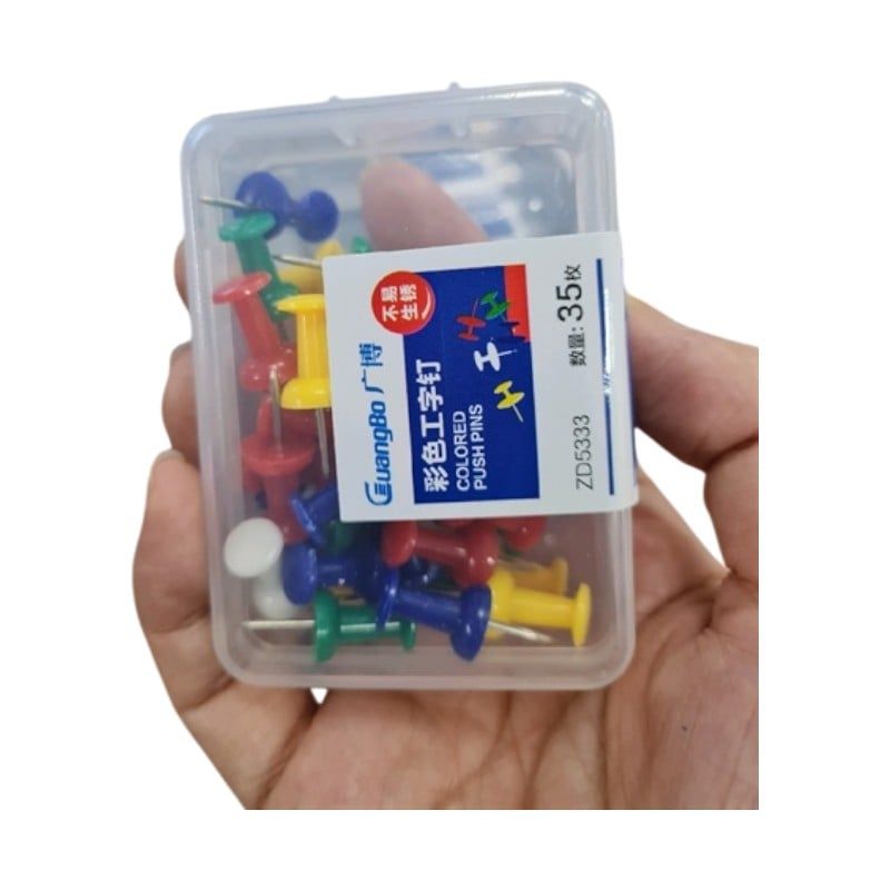 đầu nhựa tròn nhiều màu nổi bật, chân ghim bằng thép hợp kim sắc bén, chuyên dùng để ghim tài liệu, thông báo lên bảng bần, bảng nỉ hoặc gỗ mềm.