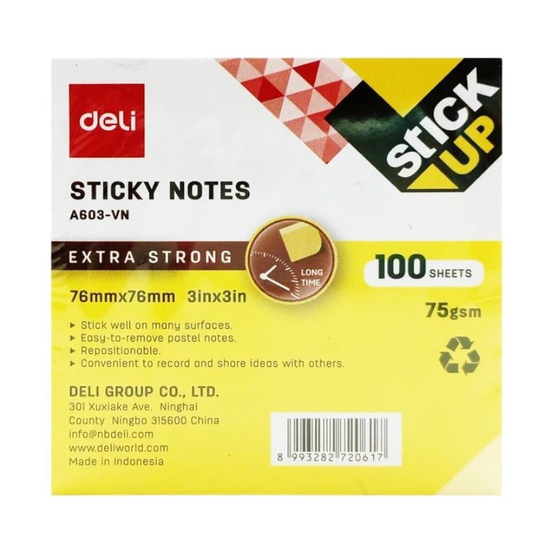 Kích thước "vàng" 3x3 inch: Đây là kích thước tiêu chuẩn nhất của giấy nhắn, đủ rộng để viết các thông tin quan trọng nhưng vẫn đủ nhỏ gọn để dán ở mọi nơi mà không chiếm quá nhiều diện tích. Lớp keo dán linh hoạt: Keo được phủ ở một mép giấy, có độ dính tốt trên nhiều bề mặt như giấy, gỗ, nhựa, kính và kim loại. Đặc biệt, bạn có thể bóc ra và dán lại nhiều lần mà không để lại vết keo dính hay làm rách bề mặt vật dụng. Chất lượng giấy ưu việt: Giấy có độ dày vừa phải, bề mặt bắt mực tốt cho cả bút bi, bút gel và bút chì. Màu sắc của giấy thường là màu vàng đặc trưng, giúp nội dung viết lên trở nên nổi bật và dễ nhận diện. Đóng gói màng co chắc chắn: Việc đóng gói bằng màng co nilon giúp bảo vệ các xấp giấy bên trong không bị ẩm mốc, bụi bẩn hay làm cong mép giấy trong quá trình vận chuyển và lưu kho..