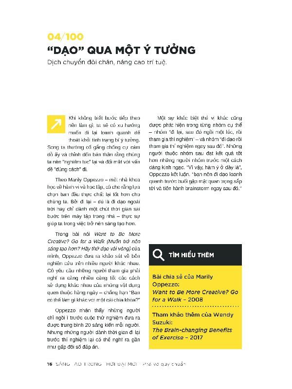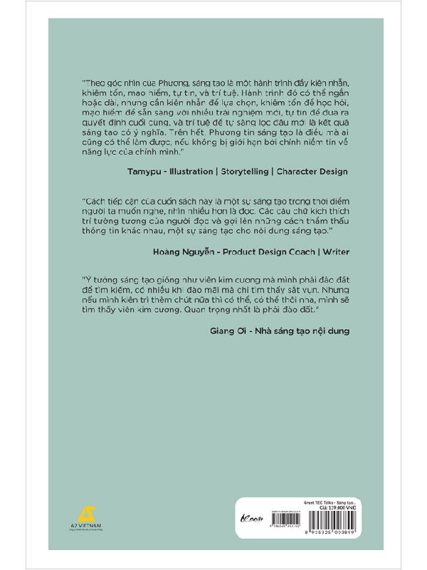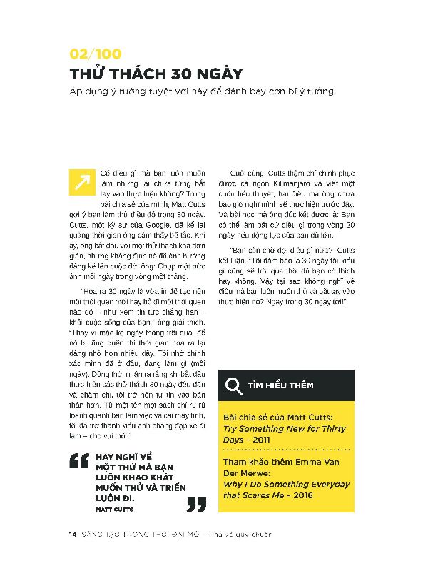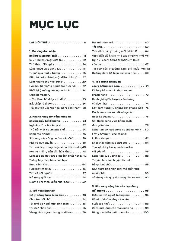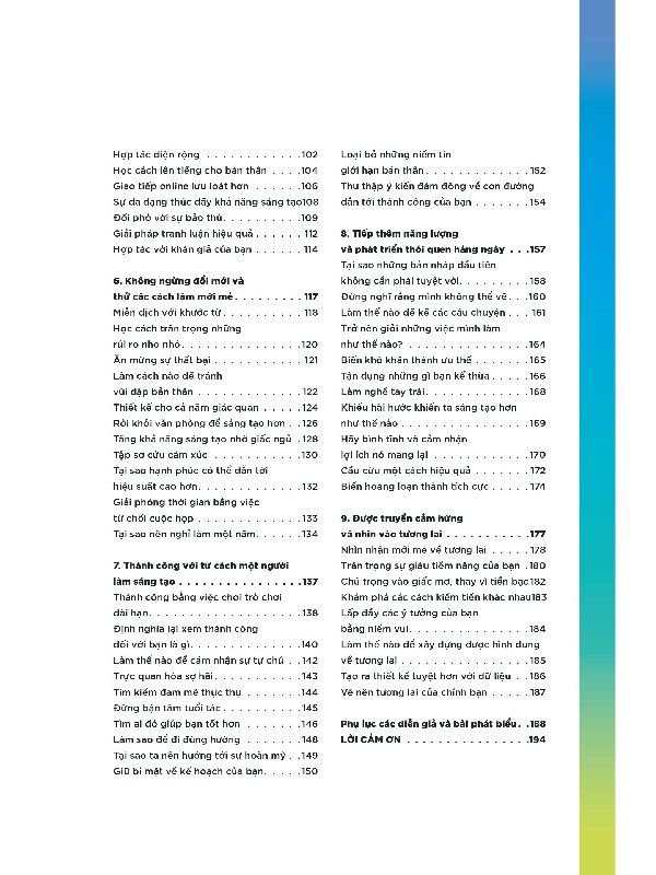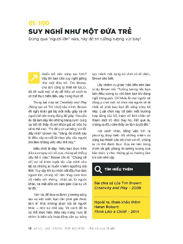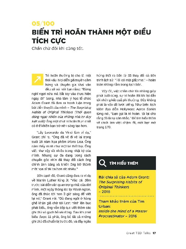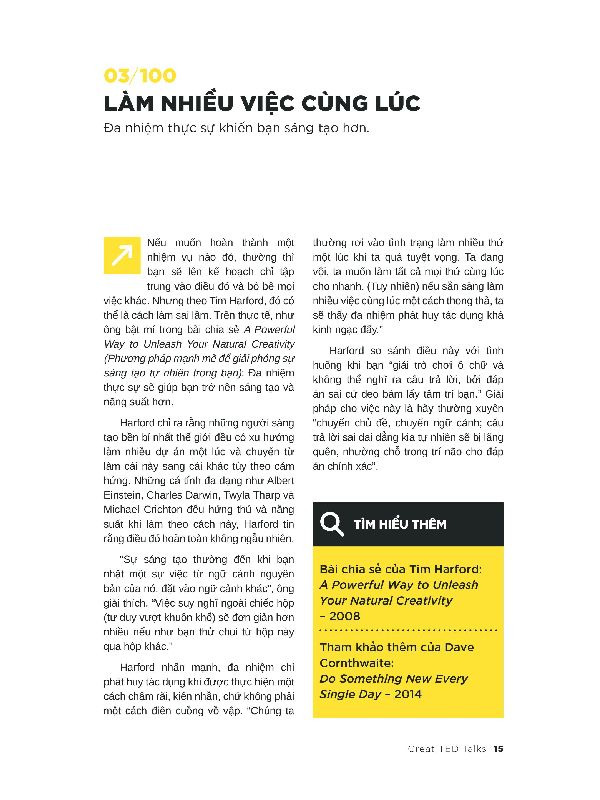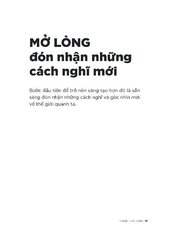 Great TED Talks: Sáng tạo trong thời đại mới - Phá vỡ quy chuẩn là cuốn “thực đơn” màu sắc gồm 100 lời khuyên được đúc kết từ 100 bài diễn văn TED hay nhất cho những người làm nghề sáng tạo. Cuốn sách đưa ra những ý tưởng có thể áp dụng vào bất cứ công việc nào yêu cầu tính sáng tạo, dù là nghệ thuật, sáng tạo nội dung, viết lách, vẽ minh họa, thiết kế, hoạt họa, làm nhạc, làm phim, diễn xuất – hoặc bất cứ công việc nào yêu cầu trí tưởng tượng, sự sáng tạo và tư duy vượt giới hạn.
