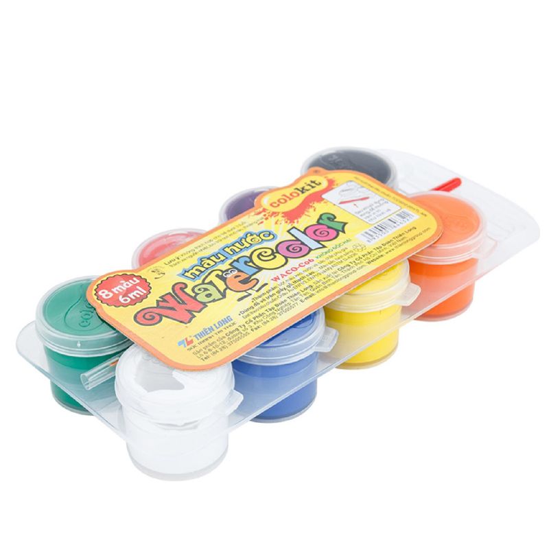 Là một sự lựa chọn tối ưu. Sản phẩm gồm 8 màu đựng kín trong lọ 6ml bằng nhựa trắng trong suốt. Màu nước Waco-06 còn tặng kèm cho các bé muỗng lấy màu và cọ, hay nắp màu có thể làm khay đựng khi vẽ. Với 6 tông màu nóng và lạnh cùng hai màu pha cơ bản là đen và trắng, các bé tha hồ mà tô tượng, vẽ trên giấy mà không sợ bị chạy màu hay thấm giấy.